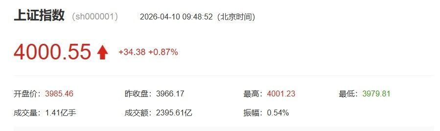 4月10日上午,上证指数拉升涨近0.9%,时隔14个交易日重回4000点。