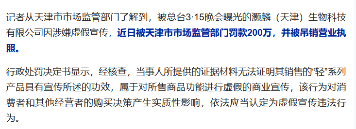 ·3·15晚会曝光“万能神药”涉事企业被吊销营业执照,并罚200万元。