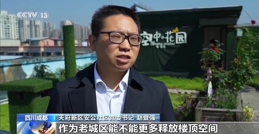 天府新区安公社区党委书记 赵登强:作为老城区能不能更多释放楼顶空间,空中花园只有1100平方米过去违建达到了1500平方米一层叠一层,违建拆除过后,让大家增绿,实现楼顶空间的探索。