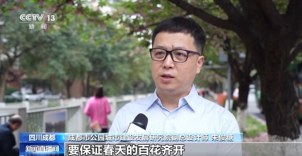 成都市公园城市建设发展研究院副总设计师 朱俊糖:我们基本上会把控在常绿6、落叶4到常绿7、落叶3的比例,保证春天的百花齐开,夏天大树成荫,秋天能看到色相的变化,灿烂的秋叶,冬日又不至于什么都掉光了,在一年四季当中去感受不同的惊喜和变化。