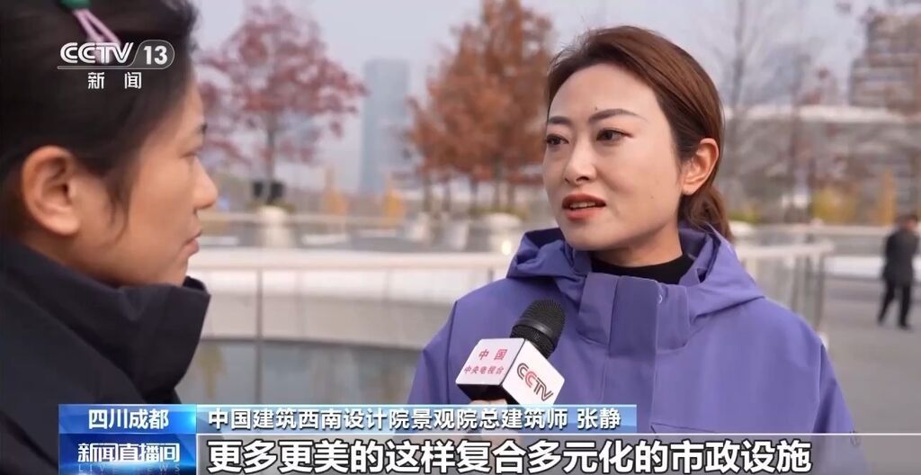 中国建筑西南设计院景观院总建筑师 张静:原来是一个水利的桥梁设施,现在形成一个多元复合的立体的桥上公园,成都的公园城市建设,其实打破了单专业的壁垒,可以看到,未来的成都可能会出现更多更美的复合的多元化的市政设施。