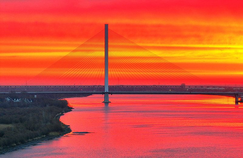 4月12日,黑龙江省哈尔滨市,朝霞如打翻的颜料盘,将天际晕染成醉人的橙红。