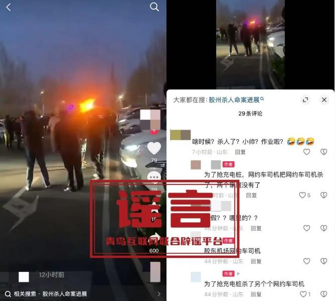 ·山东青岛胶州网约车司机为抢充电桩杀人?青岛市公安局核实,该信息为谣言,网传视频为车辆轻微刮擦交通事故现场。公安机关正组织依法严厉打击造谣传谣违法行为。