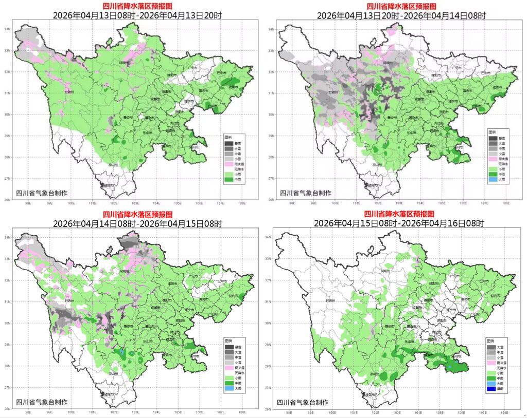 14日白天到晚上,盆地大部阴天间多云有阵雨或雷雨,局地有中雨;川西高原大部和凉山州北部阴天间多云有阵雨(雪)或雷雨,局部地方有中雨或中雪,高海拔山区有大雪,攀西地区其余地方多云间晴。