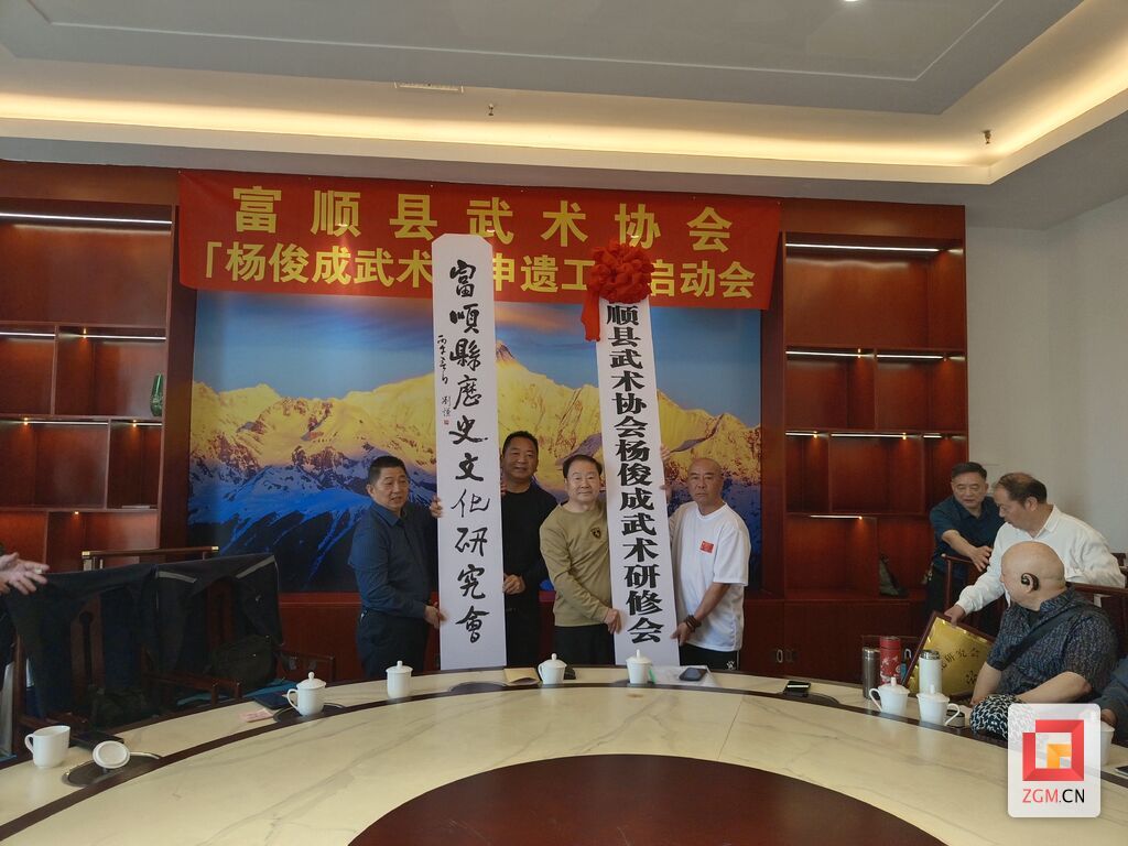 会上,富顺县武术协会为杨俊成武术研修会授牌,县历史文化研究会与研修会共同挂牌、合署办公。与会嘉宾围绕杨俊成武术的历史传承、技艺特色、文化价值展开交流,明确申遗工作目标与步骤。