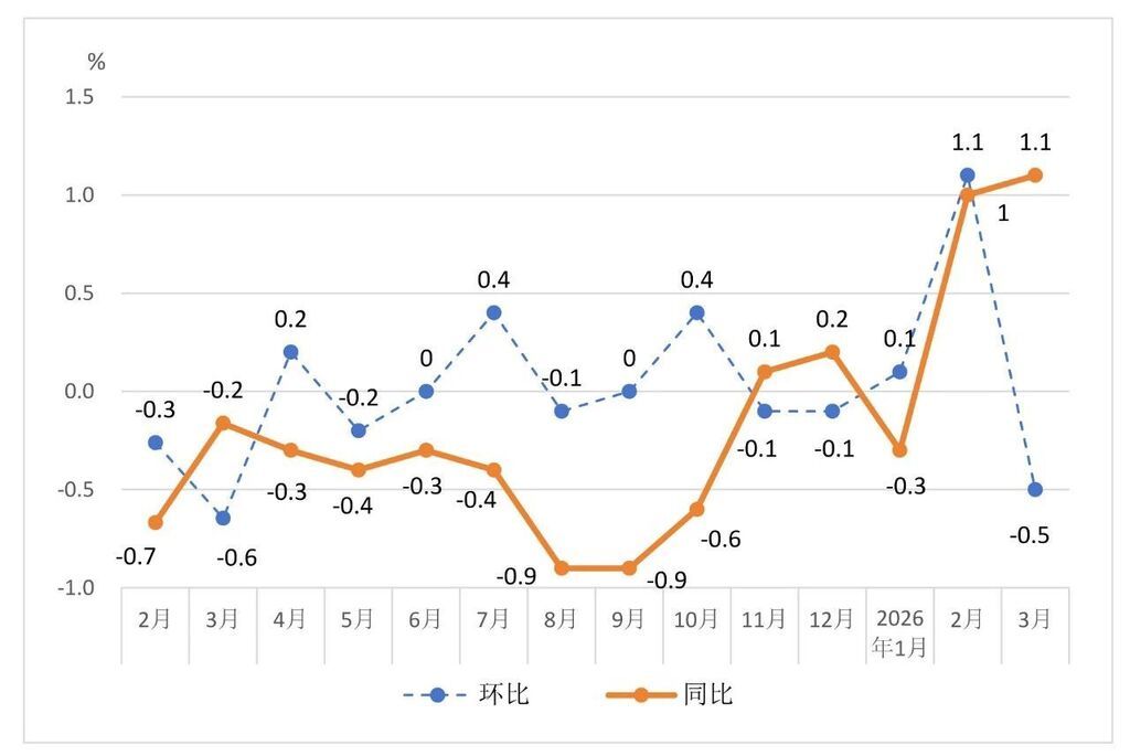 4月13日,国家统计局四川调查总队发布数据显示,3月份,四川居民消费价格指数(CPI)同比上涨1.1%,涨幅比上月高0.1个百分点;环比下降0.5%,与上月相比由升转降。同时,四川工业生产者出厂价格指数(PPI)环比上涨1.0%,同比持平,结束了连续41个月的同比下降趋势,出现触底回升信号。