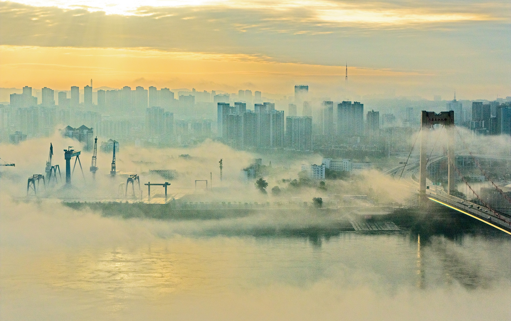 4月12日清晨,连日降雨后的宜昌城区云雾缭绕,空气清新。城区地标至喜长江大桥在薄雾与水汽中若隐若现,桥身与江面相映成趣,呈现出如梦似幻的水墨意境,成为雨后江城一道独特的风景线。