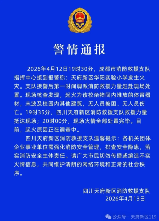 ·四川成都一小学发生火灾,成都消防通报:杂物间体育器材起火,无伤亡。