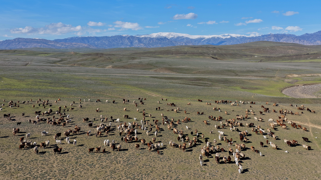 4月12日,新疆阿勒泰地区百万头只牲畜开启春季大转场,有序转至春秋过渡牧场。