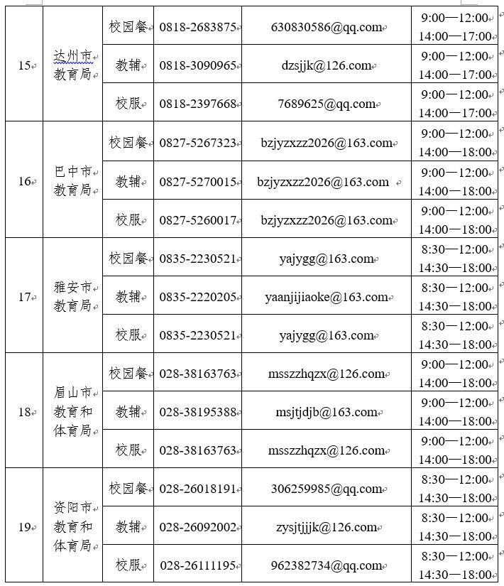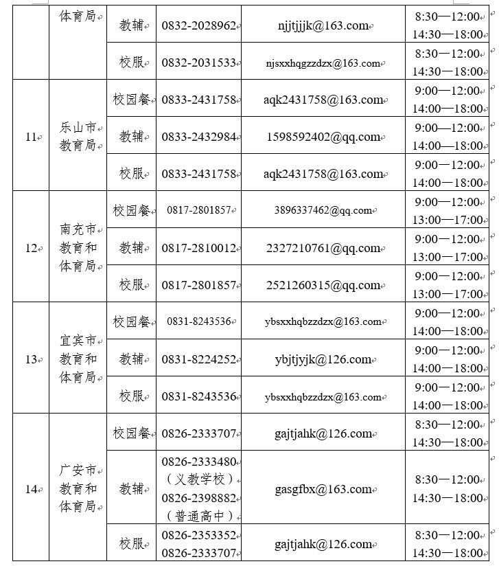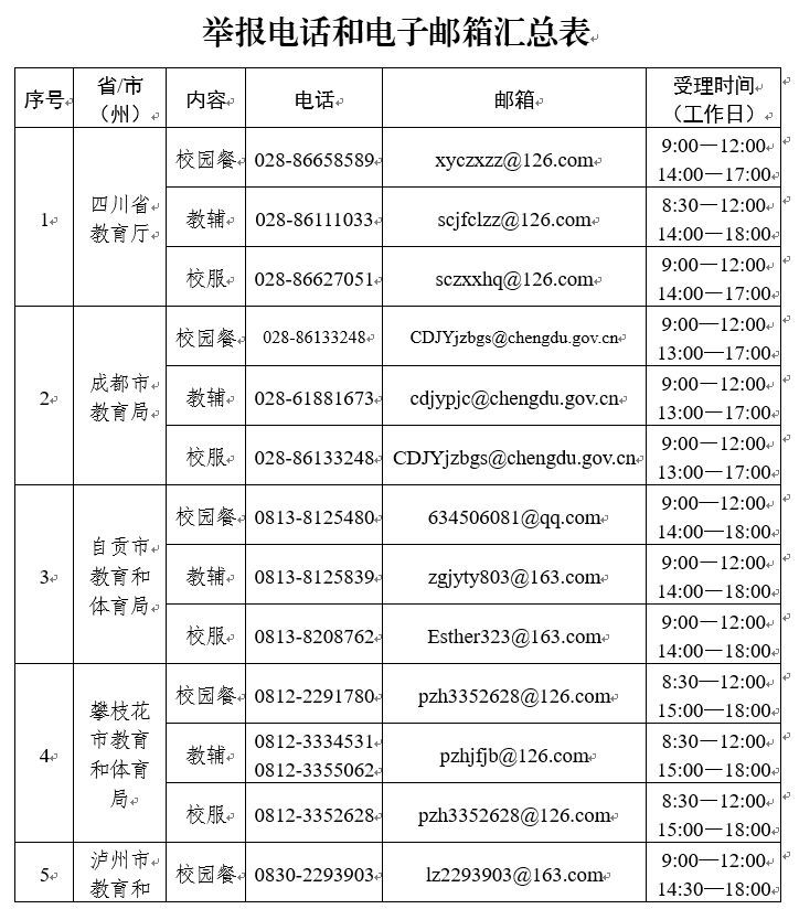 4月14日,四川省教育厅将深化治理全省中小学“校园餐”、利用征订教辅及购买校服谋利等突出问题举报电话和电子邮箱向社会公布。即日起至12月31日,欢迎社会各界反映中小学“校园餐”、利用征订教辅及购买校服谋利方面存在的问题线索和相关证据材料。