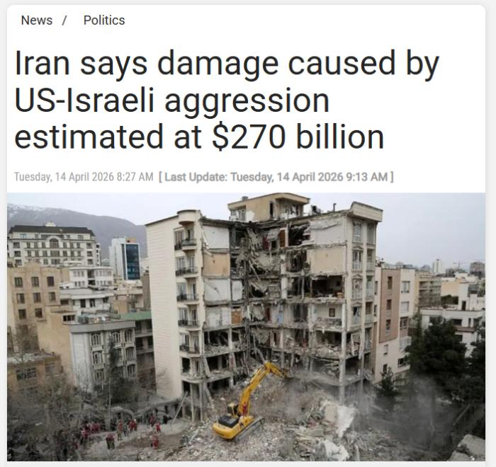 中新网4月14日电 据伊朗英语新闻电视台(PressTV)14日报道,伊朗政府发言人说,据初步估计,美国和以色列的军事打击给伊朗已造成2700亿美元损失。