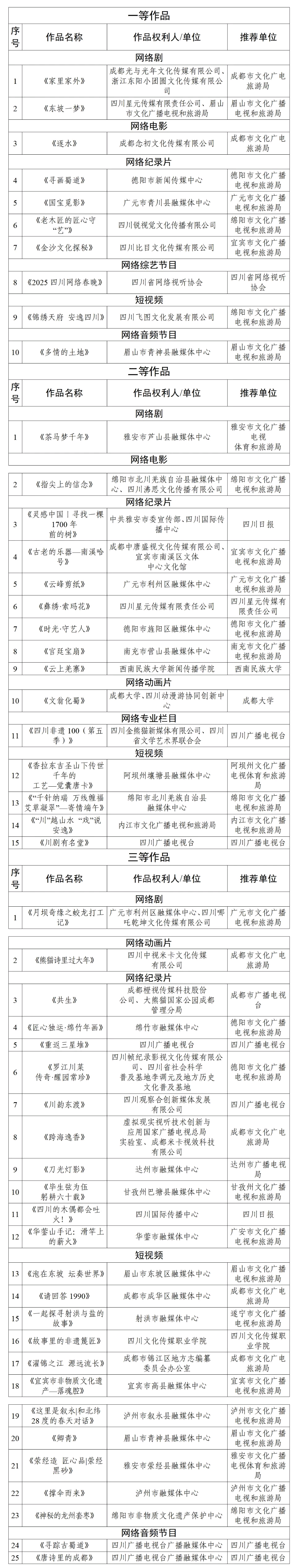 据悉,2025年“百部川扬”网络视听作品征集传播活动,累计征集原创作品3710部(期)。“神秘蜀韵 百部川扬”网络视听精品创作活动,共收到申报作品510部(期),评选优秀作品50部,两项活动通过海内外多平台联动传播,全网总流量突破百亿,有力推动了四川省网络视听内容建设与文化繁荣发展。