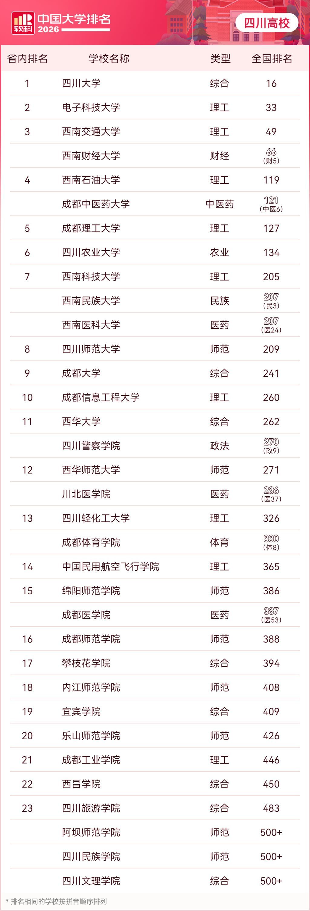 4月15日,高等教育专业评价机构软科正式发布“2026软科中国大学排名”,四川共有43所高校上榜。