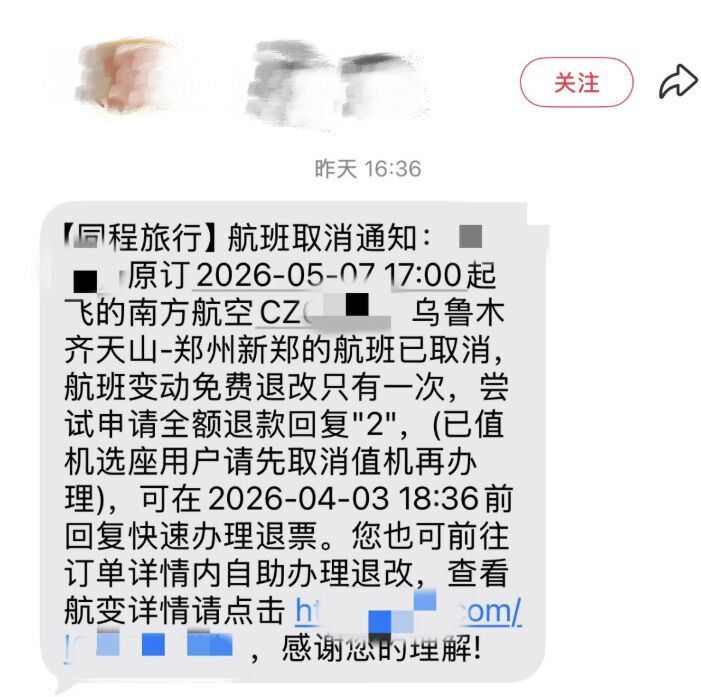 “提前一个多月预订的航班,突然被取消了。”近日,一些网友在社交平台上纷纷吐槽航班被临时取消的经历。其中一名网友反映,自己预订的5月7日乌鲁木齐直飞郑州的南航航班被取消。随着“五一”假期临近,一些早已订好酒店、门票的旅客,被航班取消的通知彻底打乱了计划。