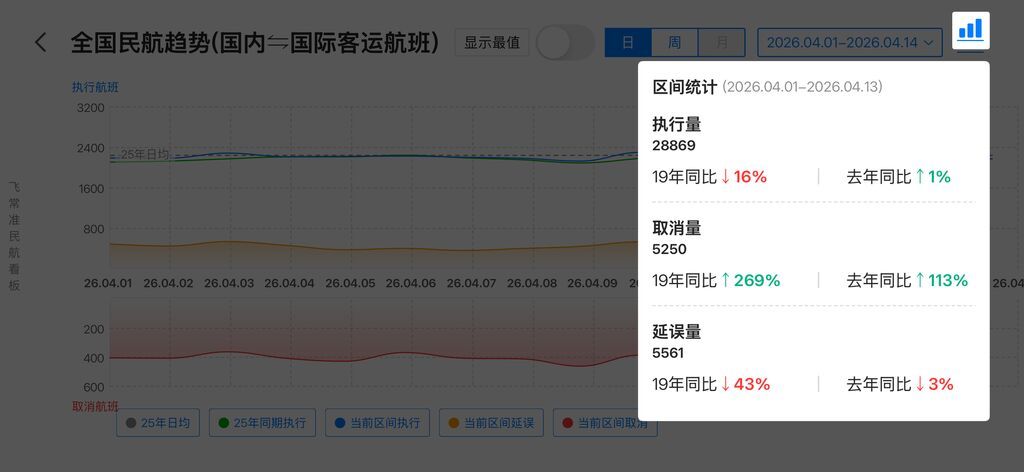 国内航司同样在收缩国际航线。记者查询国航官网发现,4月8日至30日,成都往返吉隆坡的CA483/4航班已取消。飞常准民航看板数据显示,4月1日—14日,国际航线取消5250班次,同比涨幅高达113%。在航司TOP10中,东方航空取消航班最多,达8050班次。从地区看,兰州、哈尔滨、乌鲁木齐机场的航班取消率较高。