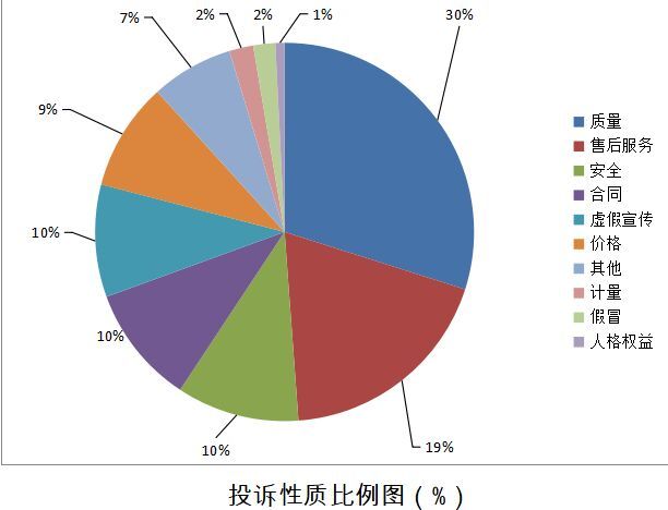 统计显示,按投诉性质划分,涉及质量问题方面的投诉案件5708件,约占总量的30%;售后服务问题3612件,约占19%;安全问题1997件,约占10%。商品、服务的质量问题仍居投诉总量之首,成为消费者投诉的主要方面,但与上年同期相比,安全方面的投诉上升趋势最为明显。质量和价格的投诉比例下降幅度位居前列。