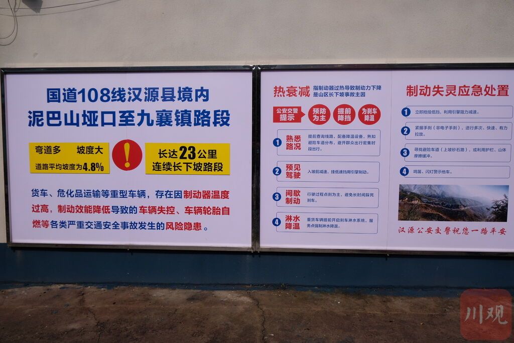 “这样的唠叨,从2018年就开始了。”汉源县公安局交通管理大队九襄中队中队长赵泽宇介绍,值守的国道108线泥巴山段,海拔3300余米,23公里连续长下坡、弯多坡陡,曾是事故多发的“魔鬼路段”,对货车刹车系统是“终极考验”。而从清溪降温点到九襄镇也要18公里,过去发生过较为严重的交通事故,也被当地人称为“烂门槛”。2018年7月,当地政府在泥巴山段设置了清溪、双溪两处强制降温点,团队开始在此驻扎,不断完善工作机制,其中就包括了交警提醒,此后事故发生率逐年减少30%。