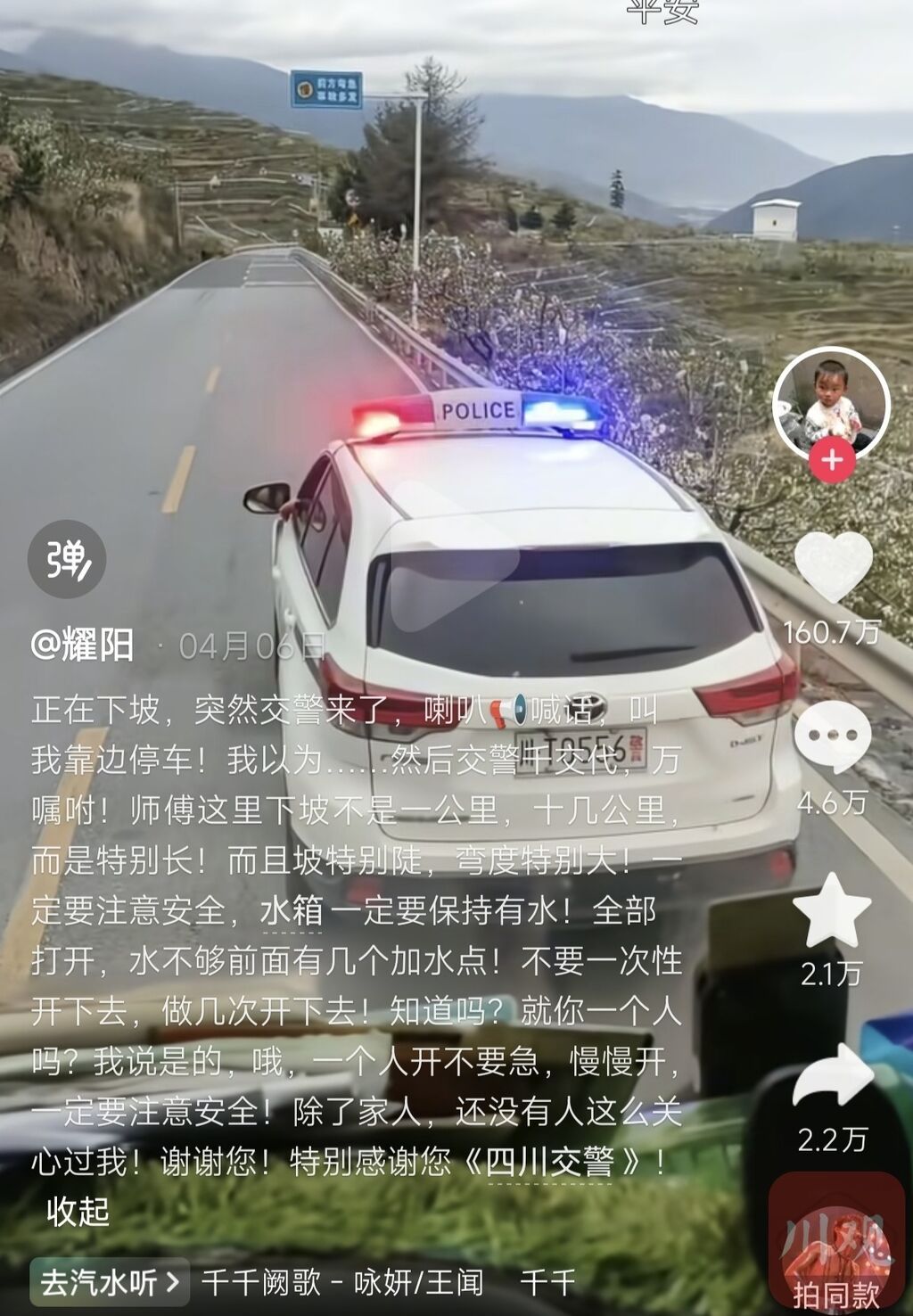 视频详细记录了交警的“叮咛”:“师傅,这里下坡不是一公里,是十几公里,而且坡特别陡,弯度特别大!一定要注意安全,水箱一定要保持有水!水不够前面有几个加水点!就你一个人吗?一个人开不要急,慢慢开,一定要注意安全……”