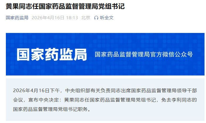 2026年4月16日下午,中央组织部有关负责同志出席国家药品监督管理局领导干部会议,宣布中央决定:黄果同志任国家药品监督管理局党组书记,免去李利同志的国家药品监督管理局党组书记职务。