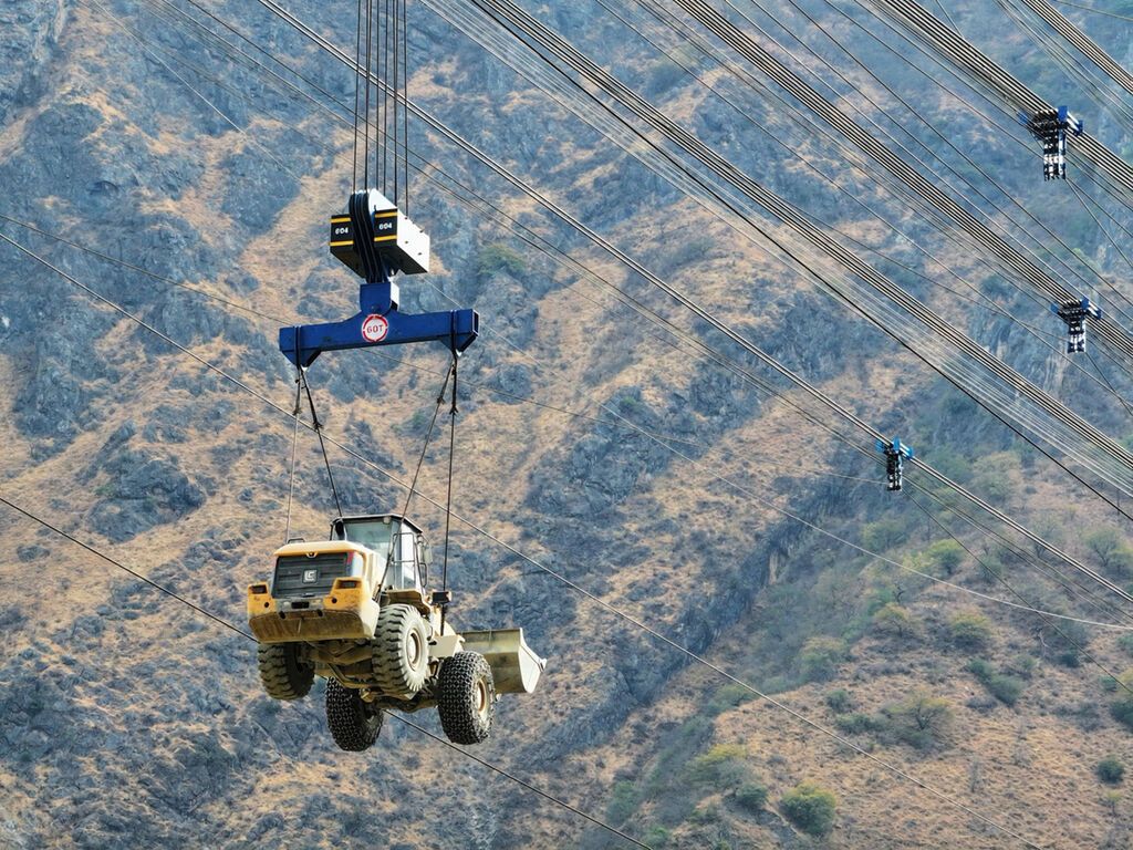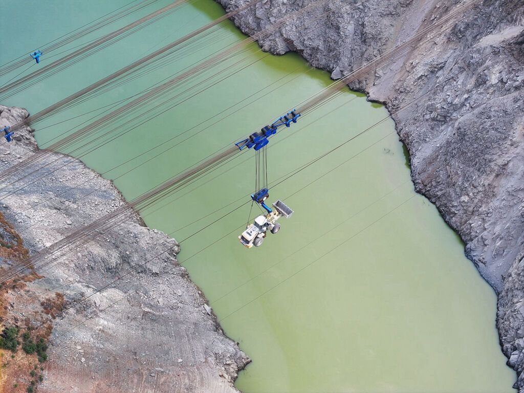 3吨临时索道——“微力先行”。早在2023年8月,理塘河特大桥就已搭建起3吨临时索道,作为施工前期的“物资摆渡车”,承担基础物料运输任务,将钻机、钢筋、水泥、小型机具等零散物资精准运抵木里岸,有效解决了“无路可通”的初始难题。