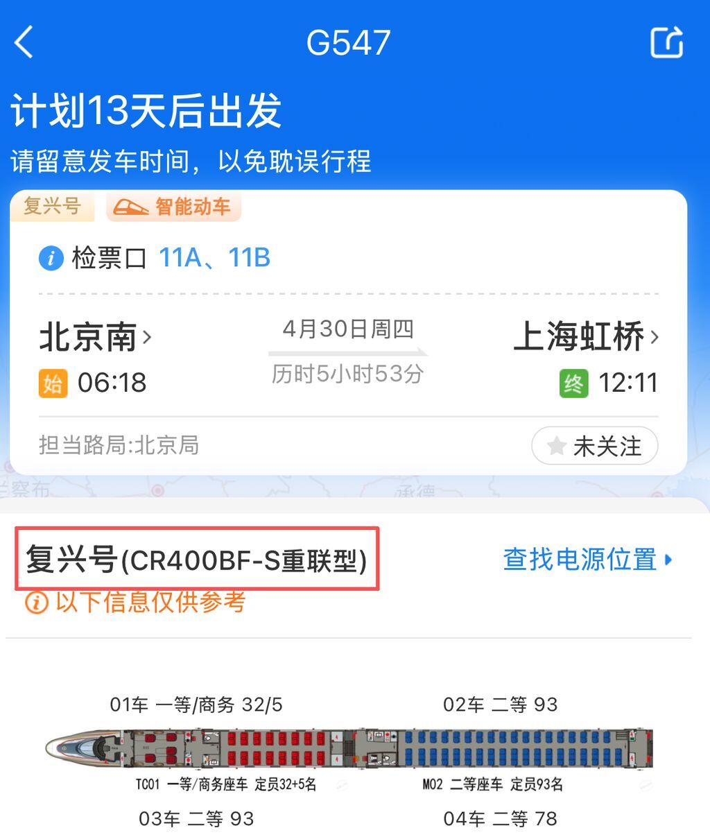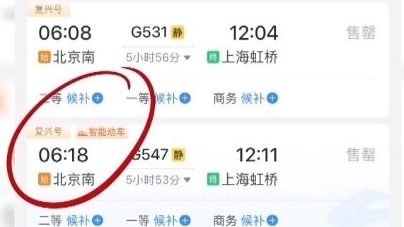 购票界面显示“复兴号”,代表所乘列车为复兴号动车组,速度快、舒适度高,适合假期中长途出行。购票界面标有“复兴号”+“智能动车”字样,表示旅客所乘列车属于复兴号动车组升级款。全车的噪声更低,在功能上也有所升级。比如在二等座的车厢中增设了USB充电接口,在一等座的车厢中还增设有可调节的头靠以及电动腿靠,躺着更舒适。