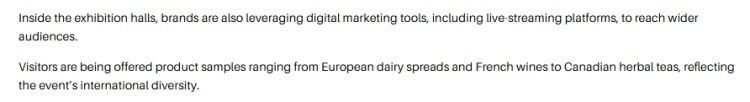 文章注意到,本届消博会有来自60多个国家和地区的超过3400个品牌参展,参展国际展品占比65%,较去年提升20个百分点。在展馆内,各品牌还借助直播平台等数字营销工具来触达更广泛的受众群体。参观者可以品尝到从欧洲乳制品、法国葡萄酒到加拿大草本茶等各种产品样品,这充分体现了展会的国际多样性。