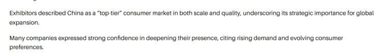 文章称,许多参展商将中国描述为兼具规模与品质的“顶级”消费市场,并强调了中国对于打开全球市场的重要性。许多企业表示,鉴于不断增长的需求和持续更新的消费者偏好,他们对深耕中国市场充满信心。