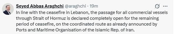 中新网4月17日电 当地时间17日下午,伊朗外长阿拉格齐在社交媒体发文称,根据黎巴嫩停火协议,所有商船在停火剩余时间内,按照伊朗港口和海事组织已经公布的协调路线,通行霍尔木兹海峡完全开放。