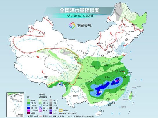 4月20日至22日,我国降水范围较大,南方多地雨势较强,西南地区东部、江汉南部、江南大部和华南中北部等地有大到暴雨,局地大暴雨,并伴有强对流天气,需注意防范。同时,受冷空气和阴雨影响,长江中下游及其以北多地气温下降,黄淮、江南等多地冷暖反差明显,公众请适时添衣,谨防感冒。