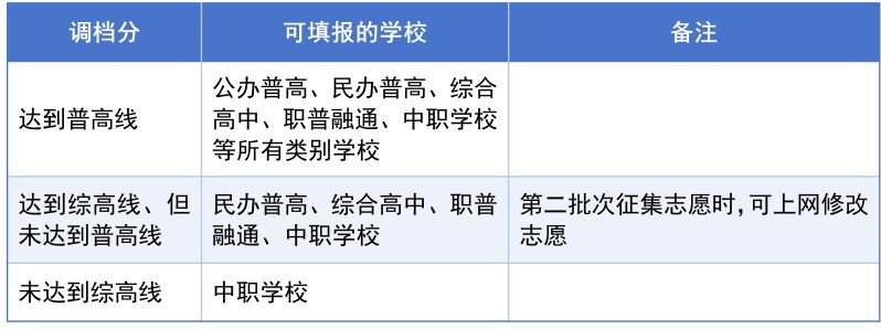 升学区域在“5+2”区域的考生调档分(中考升学成绩+政策加分)达到相应分数线后,可填报对应类别学校的志愿。
