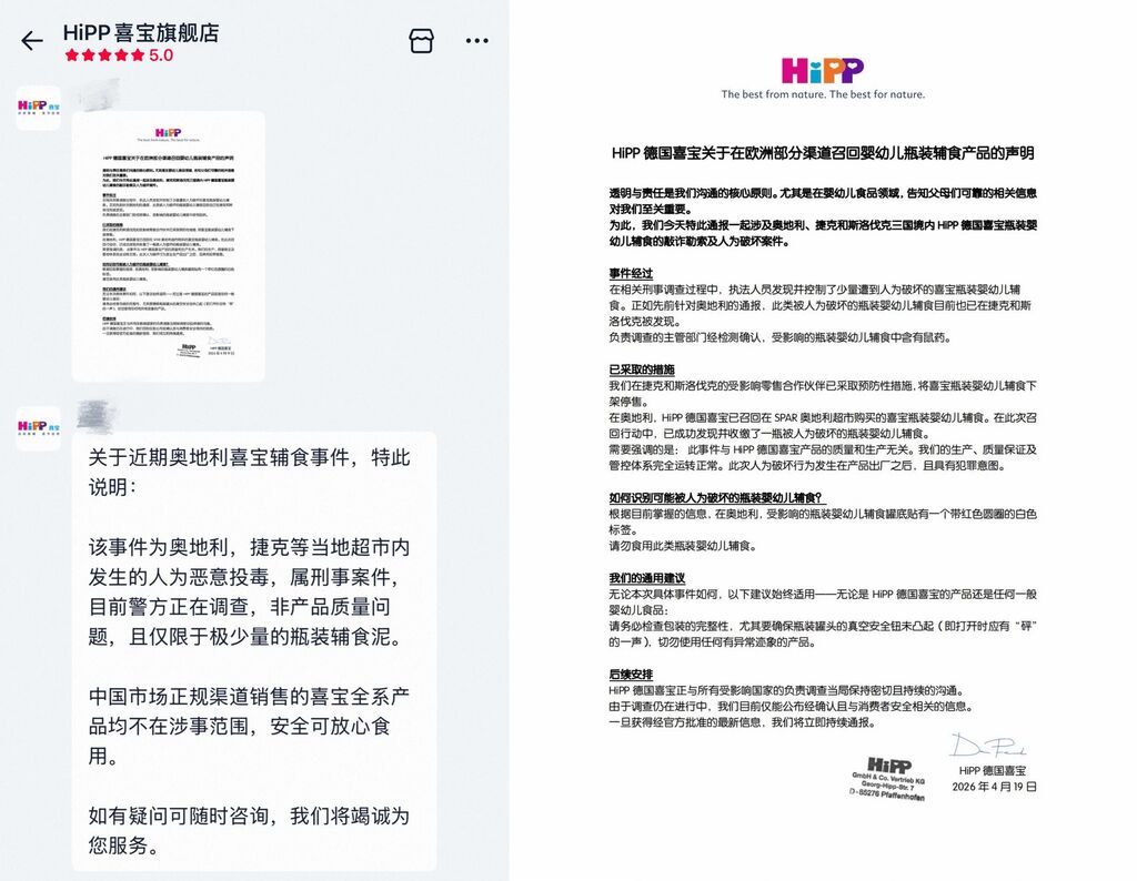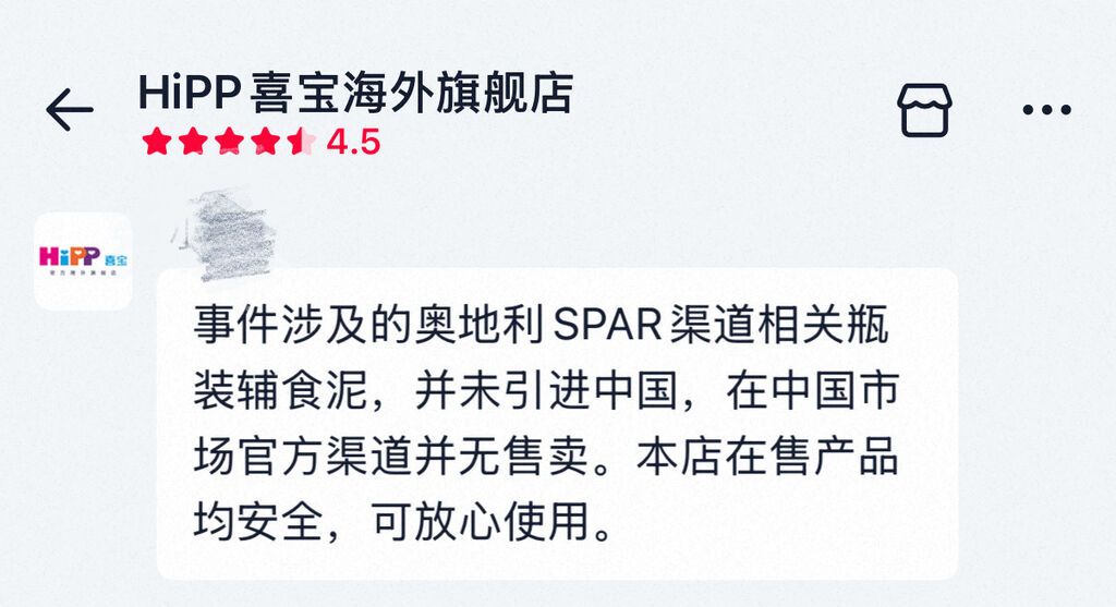线上渠道方面,记者在淘宝平台“HiPP喜宝海外旗舰店”咨询客服。对方回应称,此次涉事产品为奥地利SPAR渠道相关的瓶装辅食泥,涉事产品并未引进中国,在中国市场官方渠道并无售卖,在售产品可放心使用。