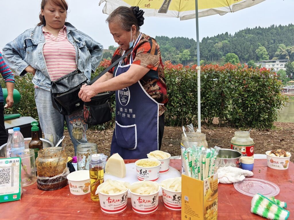 在水月集码头前,村民方中兰的凉面摊前排起长队。“以前在镇上市场一天卖200元,现在回村里卖,人多的时候半天就能赚2000元。”