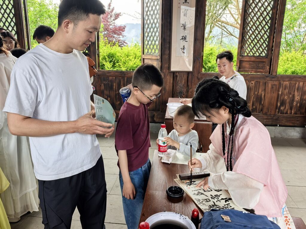 非遗拓印区排起长龙。安岳本地游客谢随兴带着两个女儿正往宣纸上捶拓,娃儿们脸上沾了墨点子也顾不上擦。“参加完活动还要在村里转一圈,空气巴适,风景也安逸。”他笑着说。