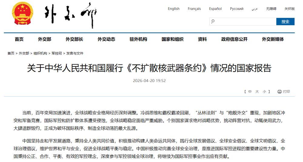 27、近年来,中国通过一系列政府文件公开宣示核政策,保持高度透明。中国自1995年以来先后发布四份军控和防扩散白皮书,2025年11月发布最新版《新时代的中国军控、裁军与防扩散》白皮书。1998年至2019年期间,中国先后发布10份国防白皮书。在上述文件中,中国对本国核战略、核政策及核军控政策等作出明确阐述。