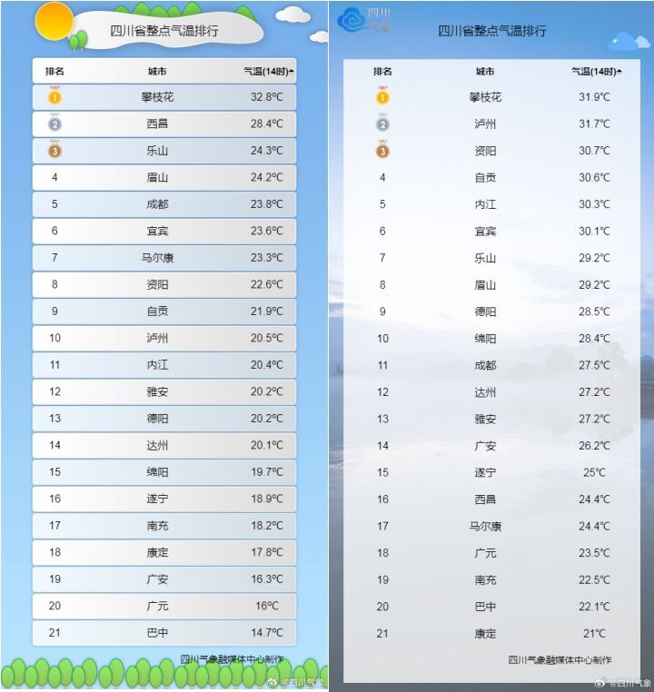 四川各城市4月20日(左)与4月19日(右)14时实况气温比较图。