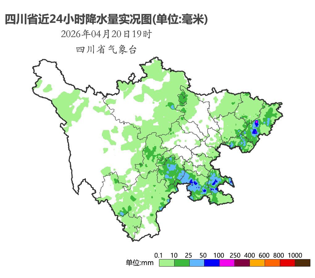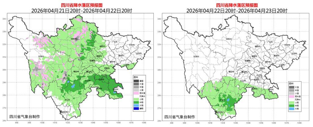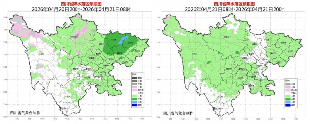 预计今天(4月20日)晚上,盆地大部阴天有阵雨,其中广元、巴中、达州、南充、广安、绵阳6市的部分地方有中雨,局地大雨;甘孜州北部东部、阿坝州和凉山州东北部多云间阴有分散阵雨(雪)或雷雨,局地有中雨或中雪。明天(4月21日)白天,盆地大部阴天有分散阵雨,川西高原大部和凉山州北部多云间阴有阵雨(雪)或雷雨。