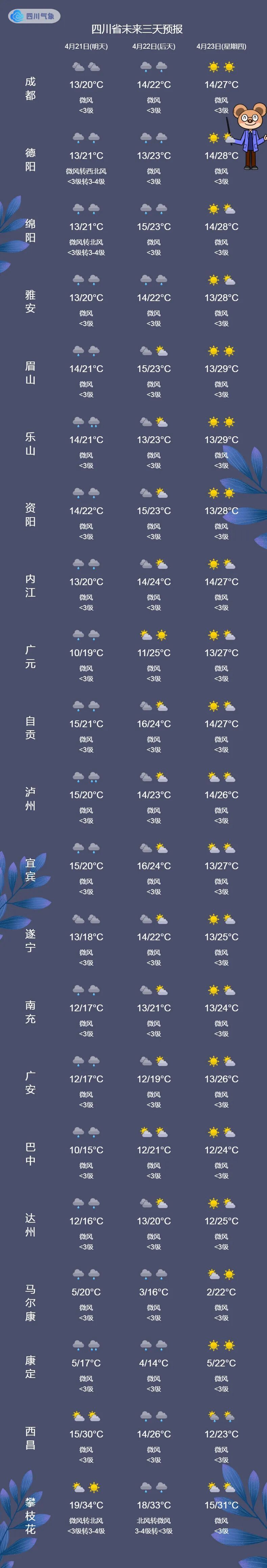 四川省气象台预计,盆地4月21日阴天有阵雨,东北部有中雨、局地大雨,日平均气温将继续下降。