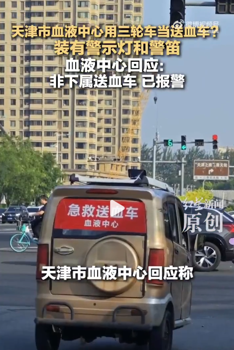 ·用三轮车当送血车还装有警示灯和警笛?天津市血液中心回应:非下属送血车,已报警。