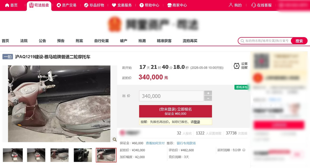 ·一沪A黄牌摩托车起价34万元拍卖,车身估值2500元,车牌值48万。