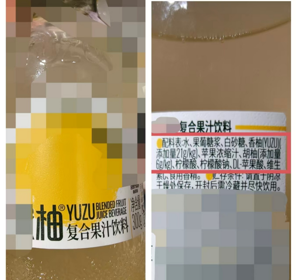 △某柚子汁复合果汁饮料因柚子含量低引发网友讨论
