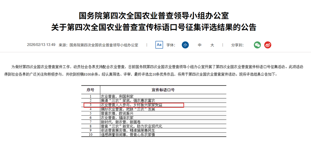 据悉,本次第四次全国农业普查宣传标语口号征集活动共收到各类投稿8100余条,经过层层筛选、严格评审,最终确定10条优秀作品用于全国“四农普”宣传工作。富顺县统计局报送的标语凭借简洁明了的表述、贴合普查主题的内涵,从众多投稿中脱颖而出,成为全国优秀作品之一。