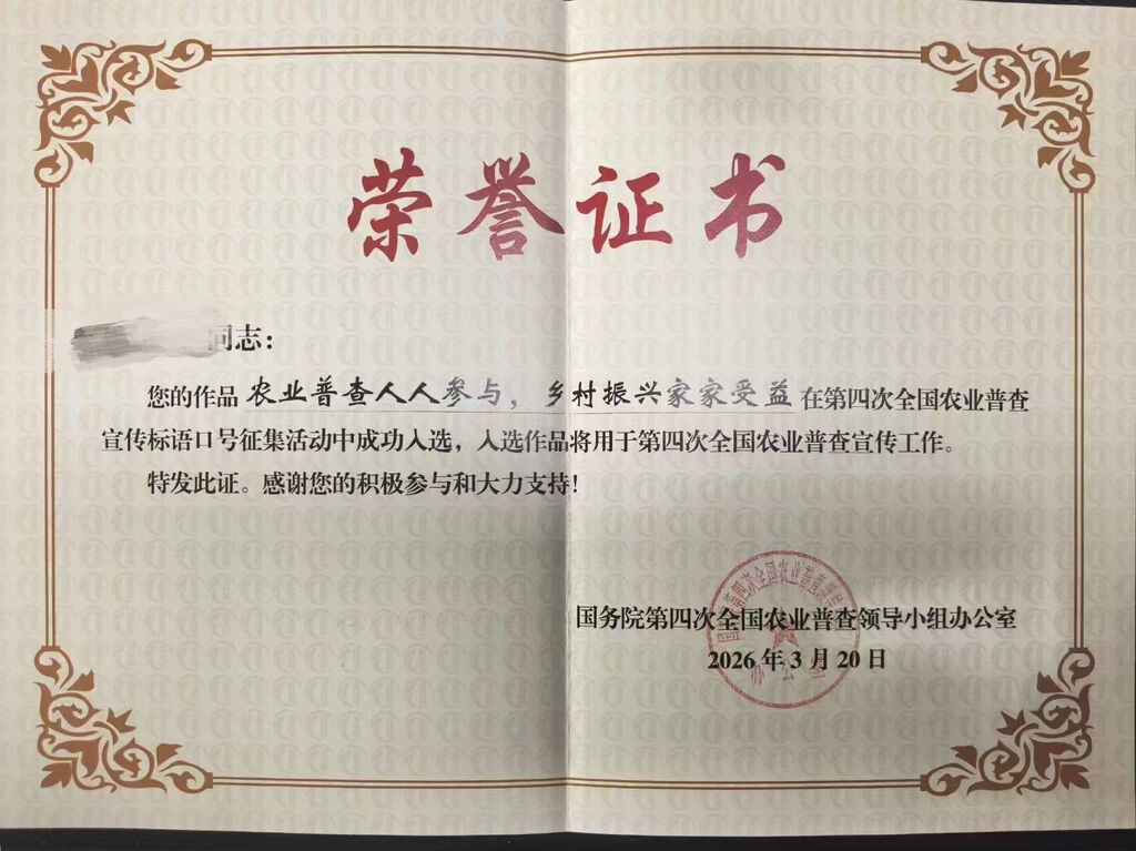 近日,富顺县统计局两名干部职工撰写的“四农普”宣传标语“农业普查人人参与,乡村振兴家家受益”,在国务院第四次全国农业普查领导小组办公室组织的宣传标语口号征集活动中,成功入选全国10条优秀宣传标语口号,相关荣誉证书已寄达两位作者手中。