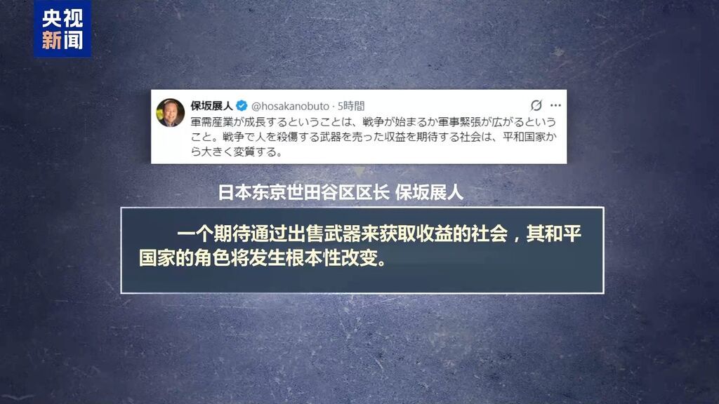 日本东京世田谷区区长保坂展人在社交媒体上表示,一个期待通过出售武器来获取收益的社会,其和平国家的角色将发生根本性改变。