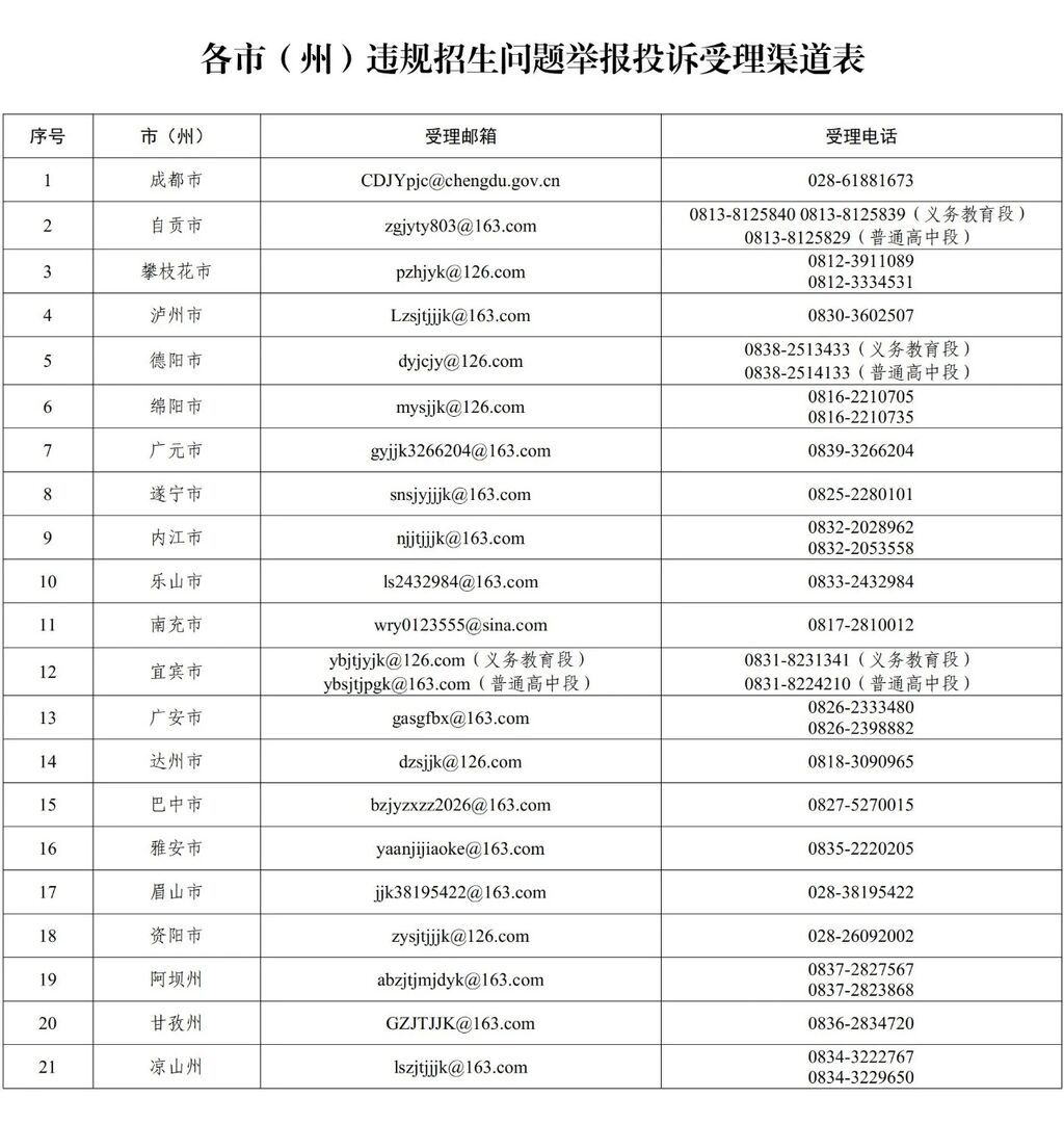 为持续提升中小学招生入学工作的规范化与科学化水平,巩固义务教育阳光招生专项行动成果,4月24日,省教育厅公布了2026年我省21个市(州)违规招生问题举报投诉受理渠道。