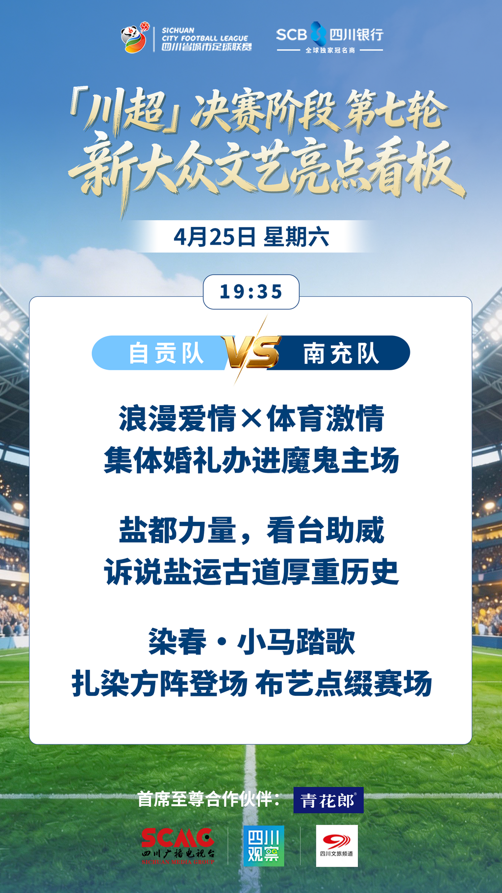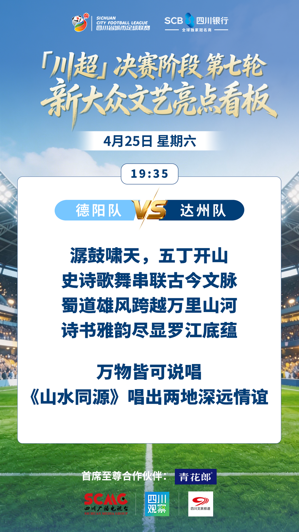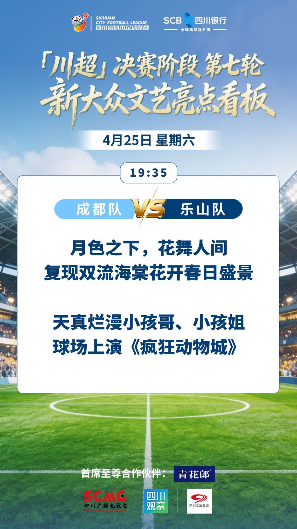 2025/2026四川银行四川省城市足球联赛决赛阶段第七轮赛事将于4月25日全面打响,成都、宜宾、自贡、德阳四地坐镇主场,分别迎战乐山、绵阳、南充、达州四队。本轮赛事持续践行新大众文艺理念,让专业足球场变身全民共享、共创、共情的文艺大舞台。四大主场有哪些惊喜亮点?观观为你提前打探!