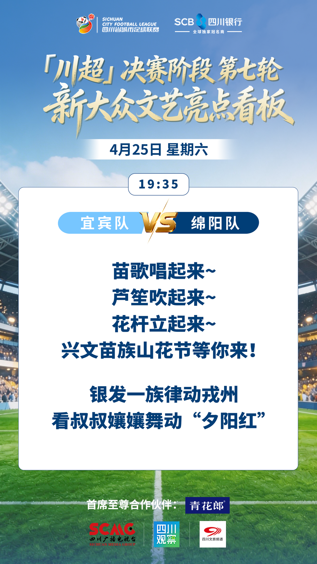 宜宾长江首城队坐镇主场迎战绵阳九州长虹队,开场文艺演出,苗族歌舞《我在花山节等你》将惊艳亮相,原汁原味呈现兴文苗族花山节民俗风情,既为即将启幕的花山节发出全民邀约,也以赛事为窗口推广非遗文化,向绵阳球迷发出暖心邀约,以文艺为纽带拉近两地距离。