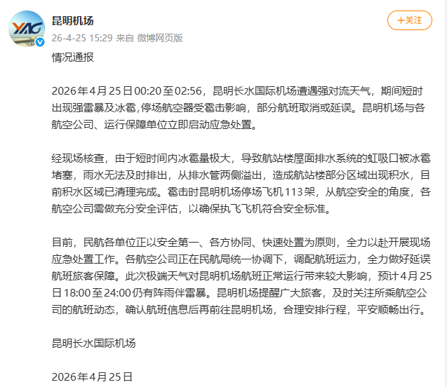 目前,民航各单位正以安全第一、各方协同、快速处置为原则,全力以赴开展现场应急处置工作。各航空公司正在民航局统一协调下,调配航班运力,全力做好延误航班旅客保障。此次极端天气对昆明机场航班正常运行带来较大影响,预计4月25日18:00至24:00仍有阵雨伴雷暴。昆明机场提醒广大旅客,及时关注所乘航空公司的航班动态,确认航班信息后再前往昆明机场,合理安排行程,平安顺畅出行。