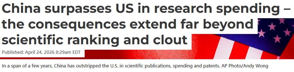 文章指出,与中国持续增加科研投入形成对照的是,美国正在削弱自身科研基础。