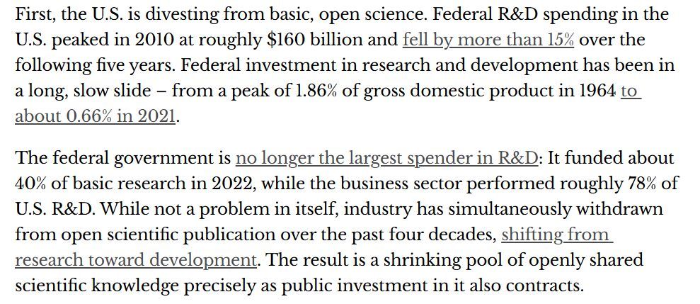 其一,美国对基础科学和开放科学的投入下降。美国联邦研发支出曾在2010年达到约1600亿美元峰值,此后五年下降超过15%;从更长周期看,联邦研发投入占美国国内生产总值的比重,已从1964年的1.86%降至2021年的约0.66%。