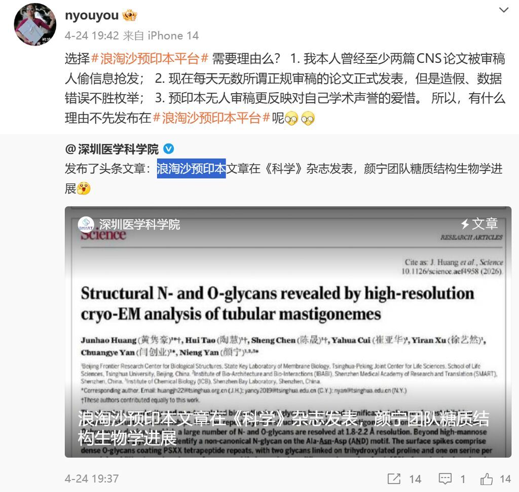 值得注意的是,颜宁院士本人也通过微博转发了上述消息,并表示,“选择浪淘沙预印本平台需要理由么? 1. 我本人曾经至少两篇CNS论文被审稿人偷信息抢发; 2. 现在每天无数所谓正规审稿的论文正式发表,但是造假、数据错误不胜枚举; 3. 预印本无人审稿更反映对自己学术声誉的爱惜。 所以,有什么理由不先发布在浪淘沙预印本平台呢?”
